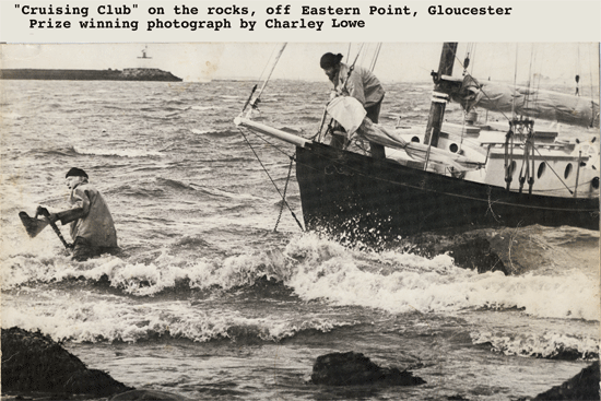 my father had borrowed it for an afternoon andtook me for my first sail in Gloucester harbor. They later sold the boat to Joe Garland, who had it rebuilt (see picture below, left) and then sailed it for a number of years before selling it to Capt. Tom Morse. It changed hands between the two of them until it finally got sold to someone from the Great Lakes, until it sank and Tom Morse got it back for “free”. Of course, in towing it with a bull dowser ahore they had split the stem down the middle and ripped off the foredeck. Joe had seen the boat I had finished the previous year and so recommended to Tom that I would be just the person to put her back together. Tom owned the building that had once been part of the Wonson wharves (lower right), and after I had finished the boat there it would remain my shop for the next twenty plus years.